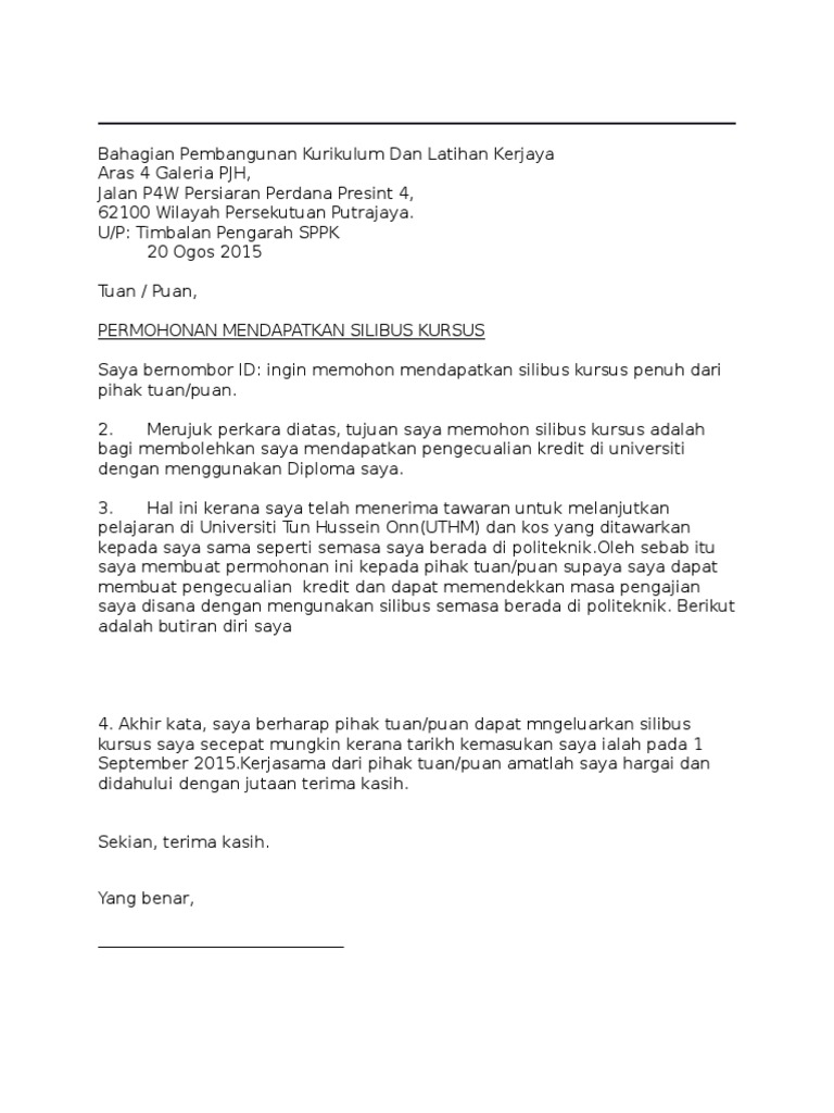 Surat Rasmi Memohon Silibus Kursus Pdf